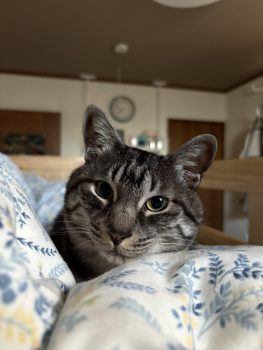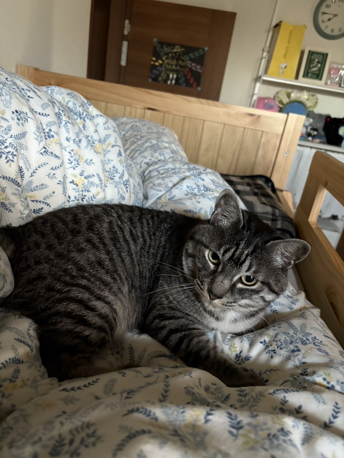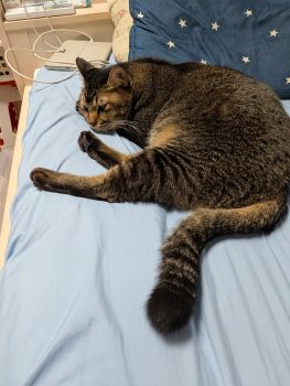 おはよう おかしゃ、起きないと仕事に遅れるよ。 魁ちゃん、起こしてくれるのはいいけれど、何故そこに寝ちゃうわけ?(笑) そして、わたしたちが出かけてしまうと今度は娘の部屋に行って お姉ちゃん、みんな出かけちゃったけど、起きなくていいの?と起こしに来るそうです。 みこちは・・・お姉ちゃんのお布団を占領して、ぬくぬく。 家族がみんな出かけてしまったら、何をして待っているのでしょうね? カメラで見ると、ほぼコロコロ寝ているだけですが・・・(笑)