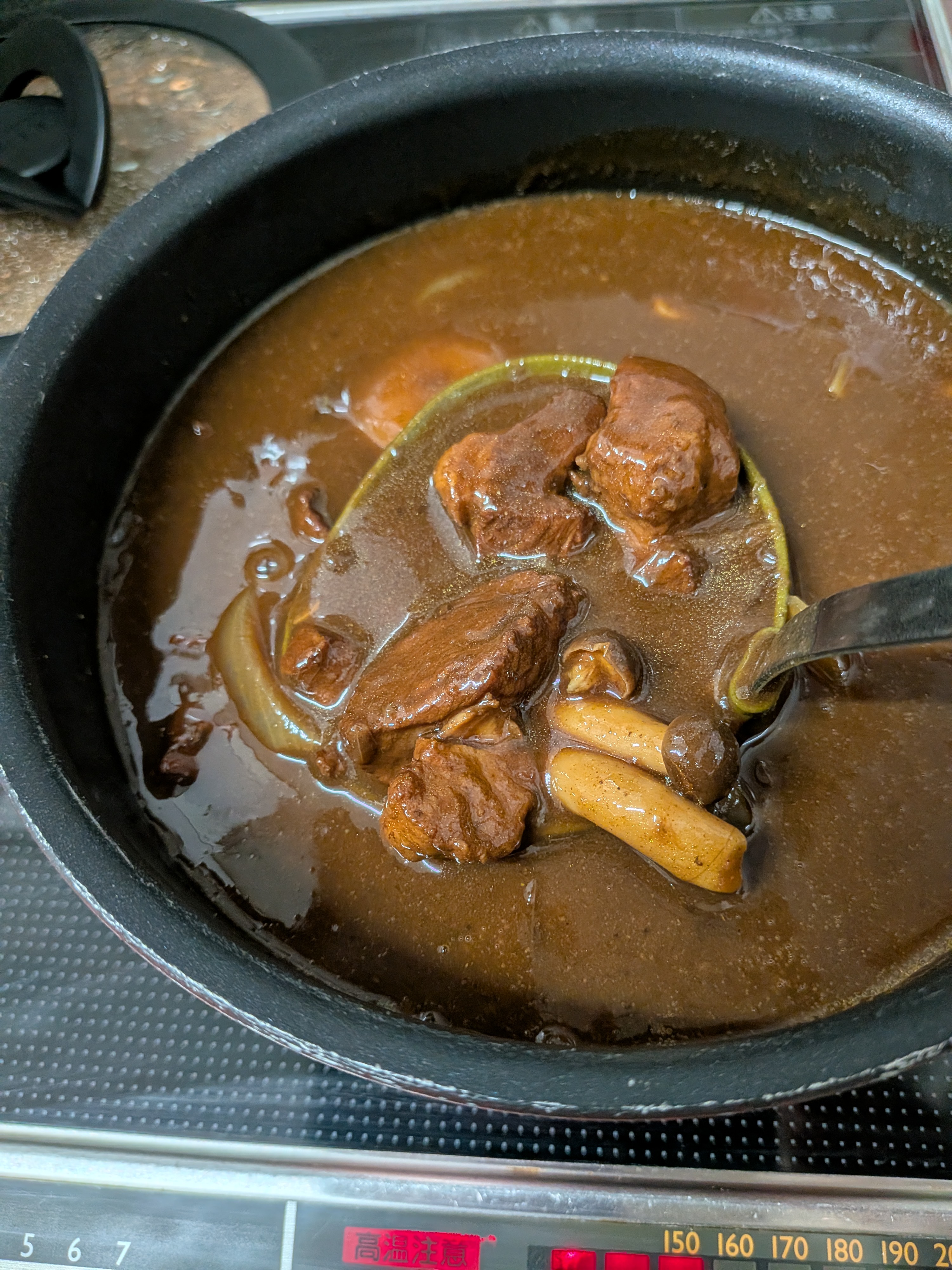 豚肉、玉ねぎ、にんじん、しめじを炒め、香辛料を加えてぐつぐつ煮込むだけですよ?