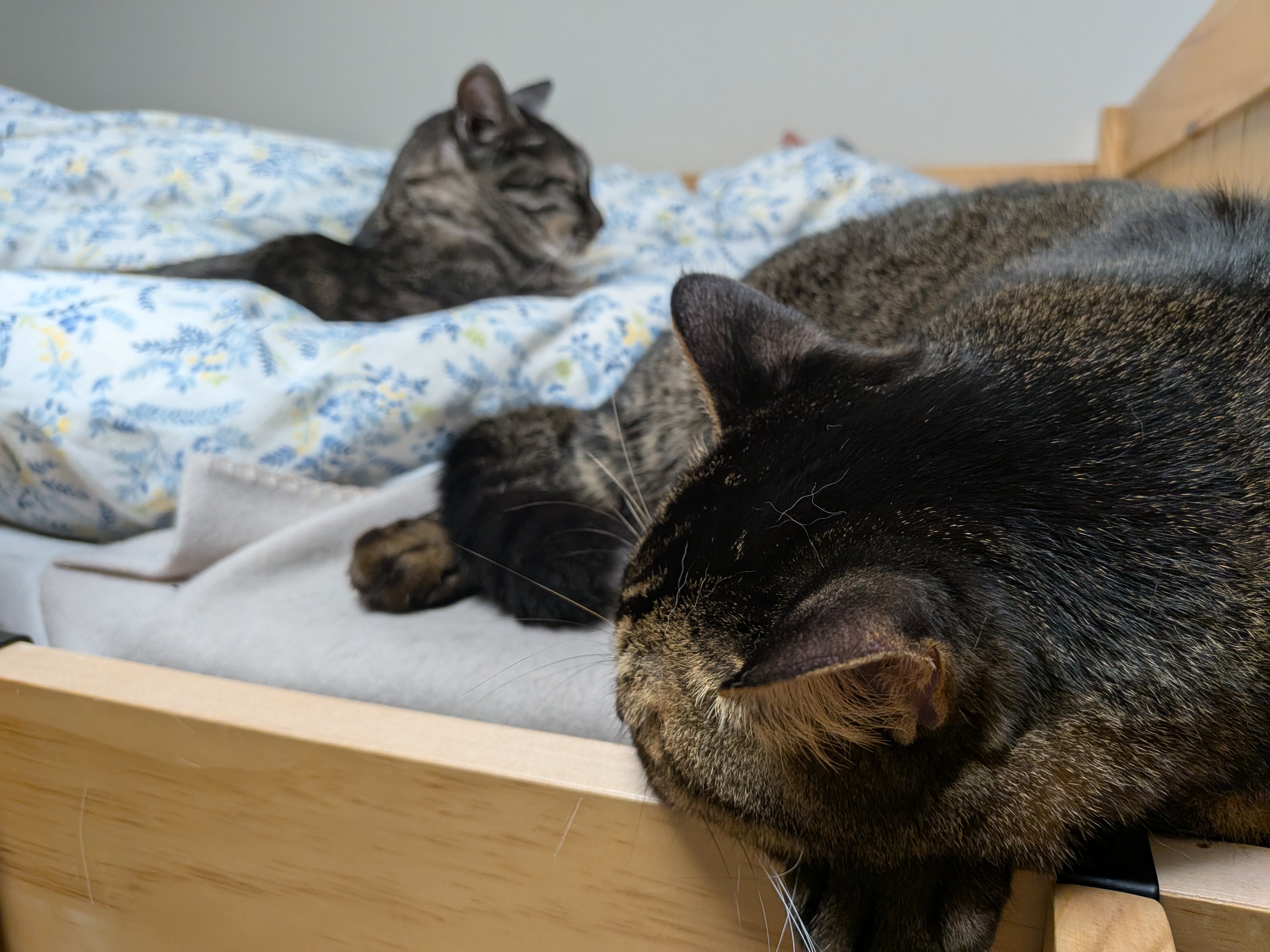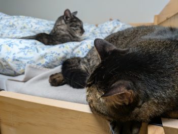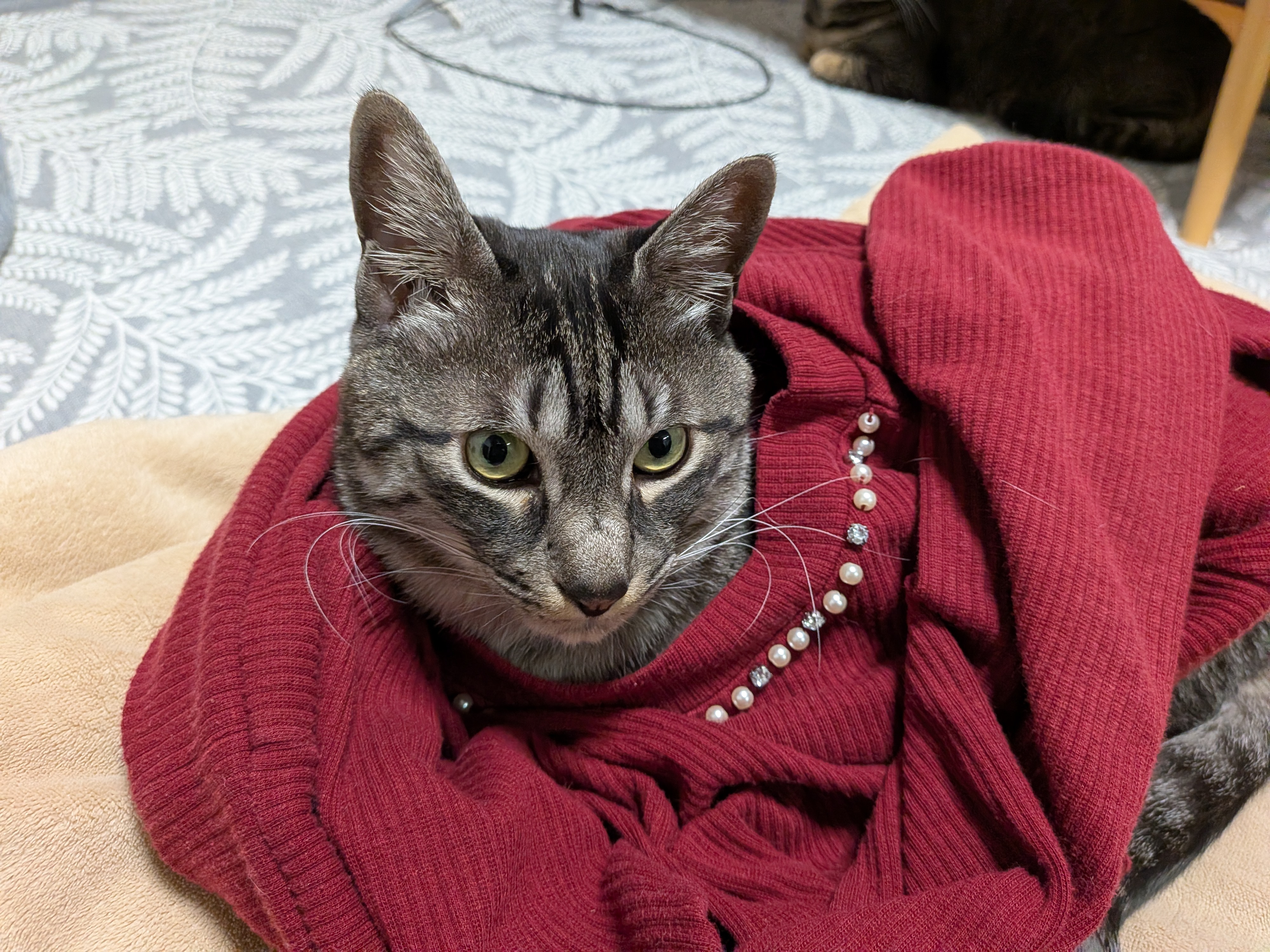 にゃんズ専用ベッド 帰宅したお姉ちゃんが着ていたセーターを着せられたみこち。 嫌がる様子はないけれど、何となく怪訝そうな表情です。 2泊3日の旅行中、ずっとお留守番をしていたにゃんズですが その間もずっとお姉ちゃんのベッドを占領しくつろいでいました。 もうこれはにゃんズのベッドで、娘は寝かせてもらう立場に逆転したようで(笑) それはそれで嬉しいお姉ちゃんでした。