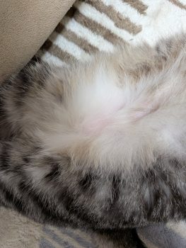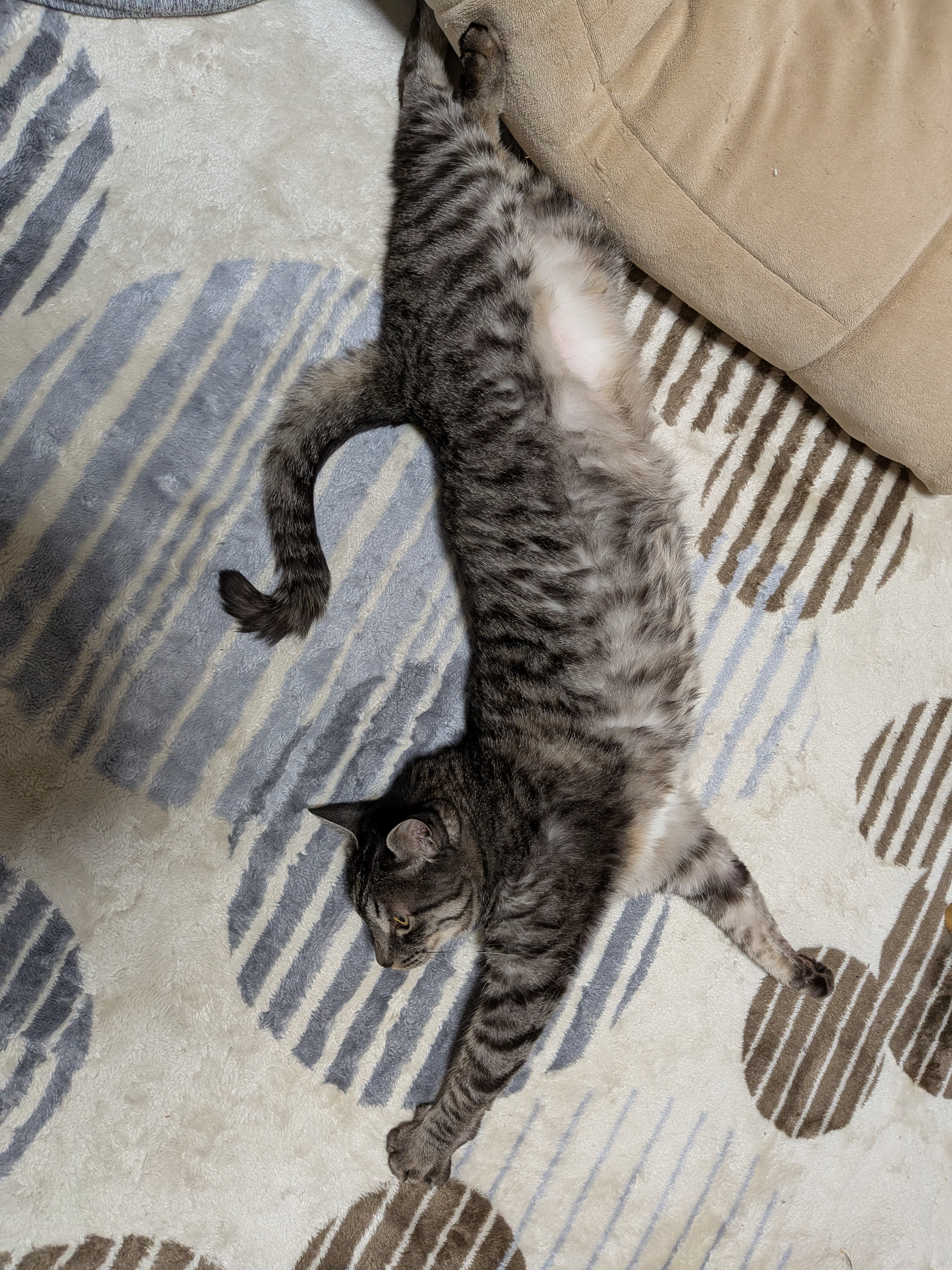 治ったよ みこちがのび~っとしているので、お腹を確認。 禿げていたお腹が綺麗に治っていました。 よかった、よかった。 病院で、薬を塗ったら患部を舐めないよう気を散らすために遊ぶように言われていて 夕食後、おもちゃで遊ぶのが習慣化していたのですが 薬を塗らなくなっても、おもちゃが入っているクローゼットの扉の前で おもちゃが出てくるまでにゃごにゃご催促するようになって本当にやかましいです(笑) 今日は、宴会の片付けもあって筋肉痛なので、勘弁してくださいな。