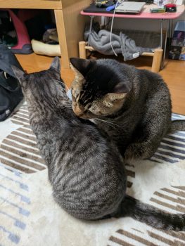 つい、「うるさーいっ!」と抱き上げたみこちを寝そべっていた娘のお腹にぽいっ!