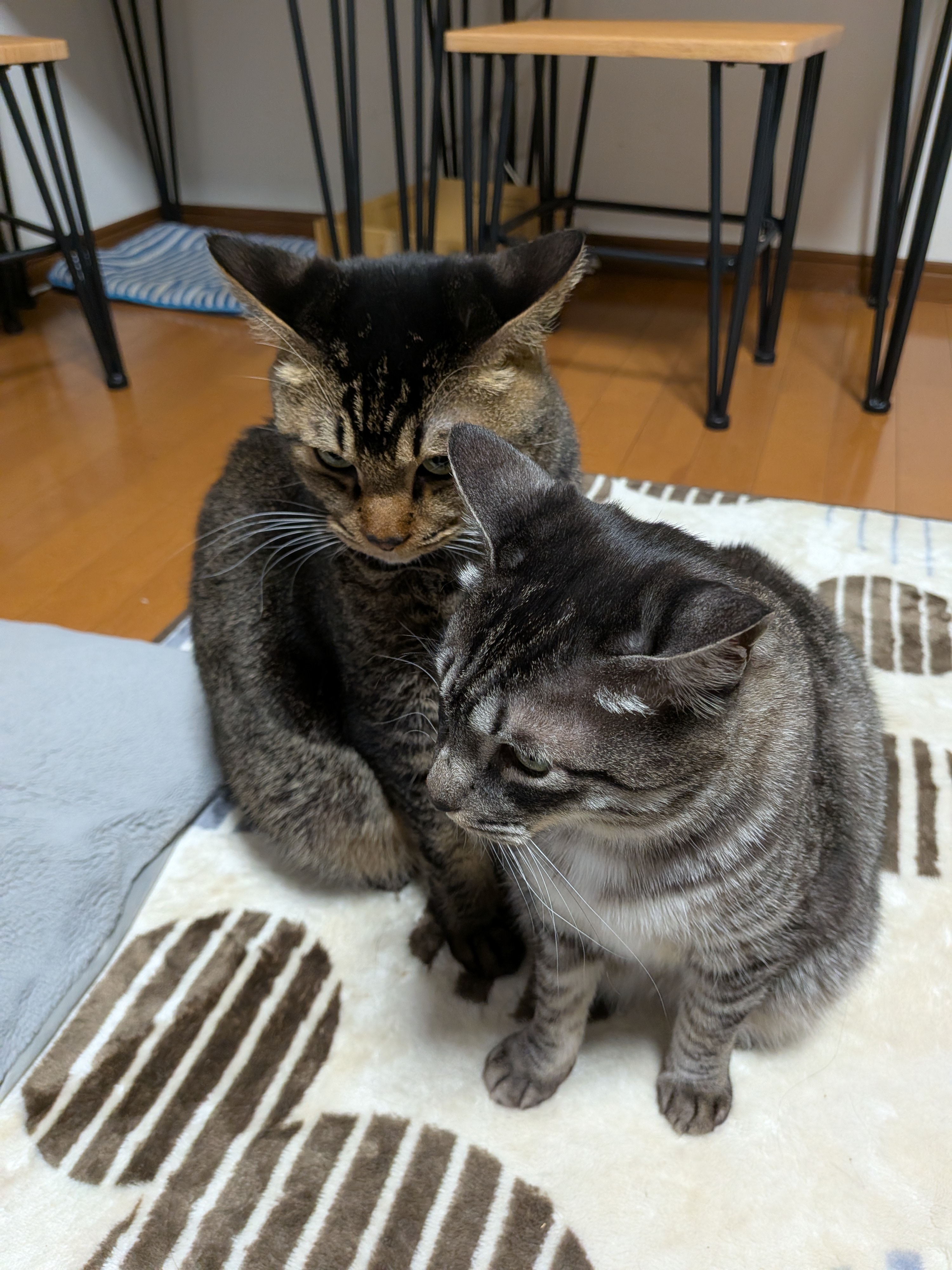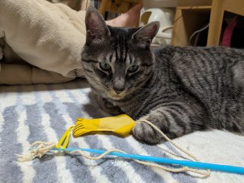 夕食後、おもちゃで遊んだりおやつをもらったりするのが日課なにゃんズ。