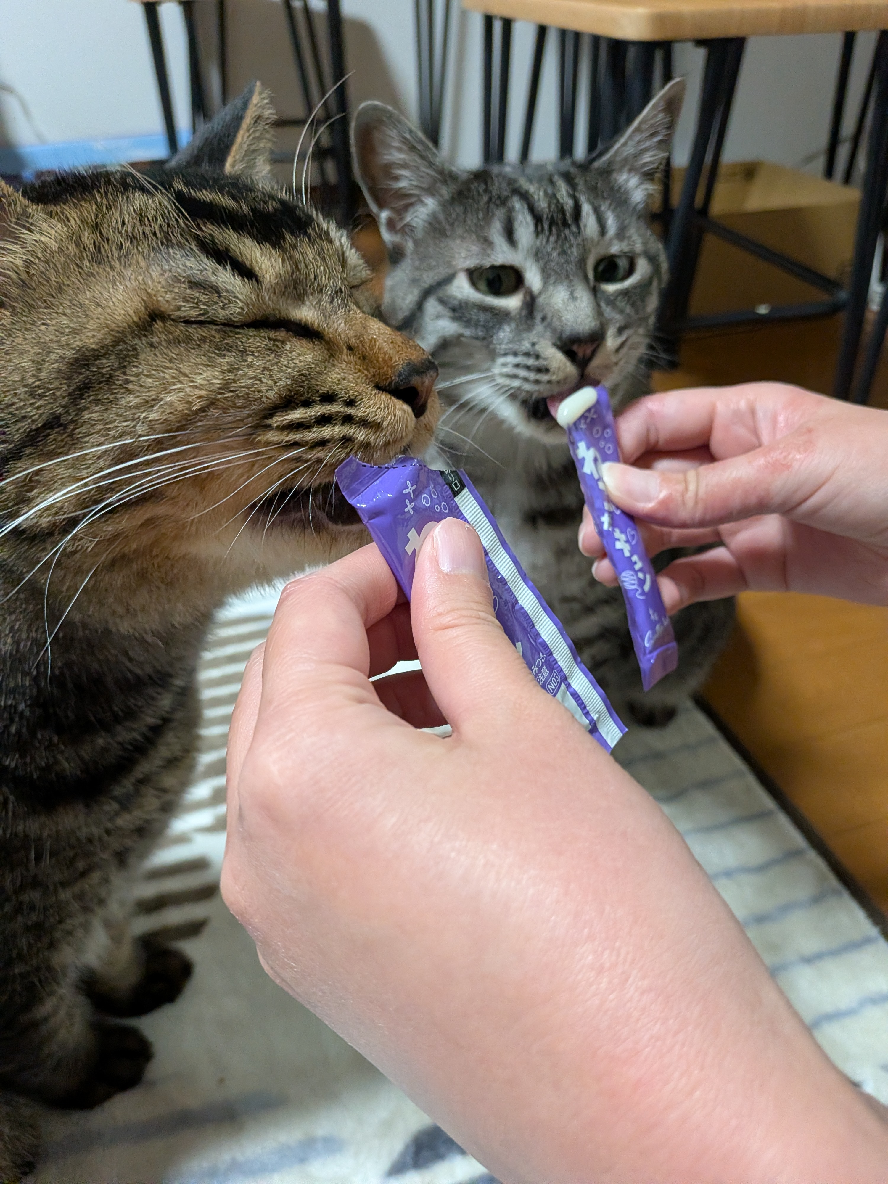 三連休最終日 土曜日は、東京ドーム内でランチ。 日曜日は、吉祥寺でランチ。 今日は一日中、自宅でだらだらごろごろ。 いやぁ、本当は仕事を持ち帰っていたんだけどね・・・ そんな自堕落な一日があってもいいよね? そして、にゃんズはおやつをもらって一緒にごろごろ。