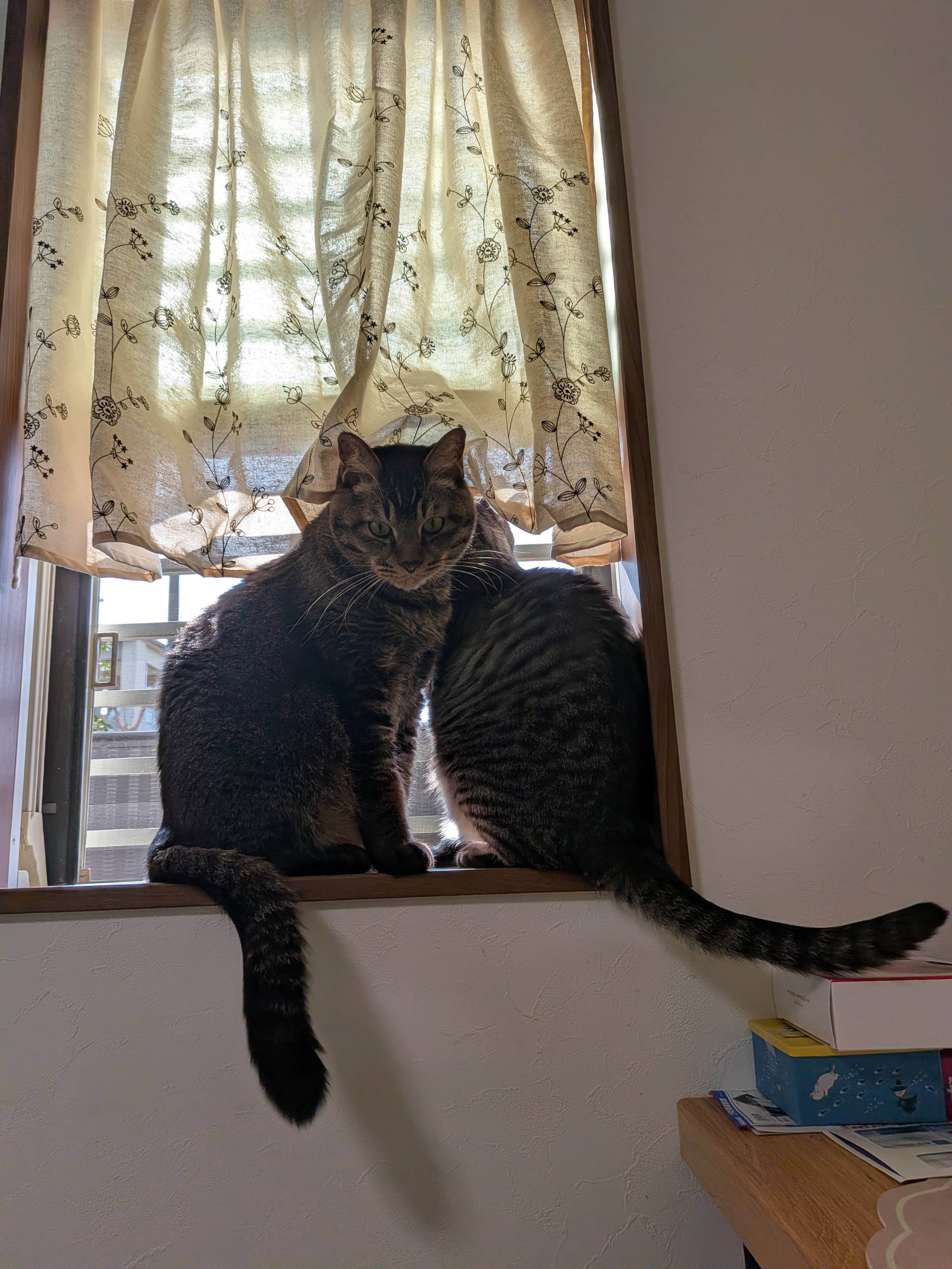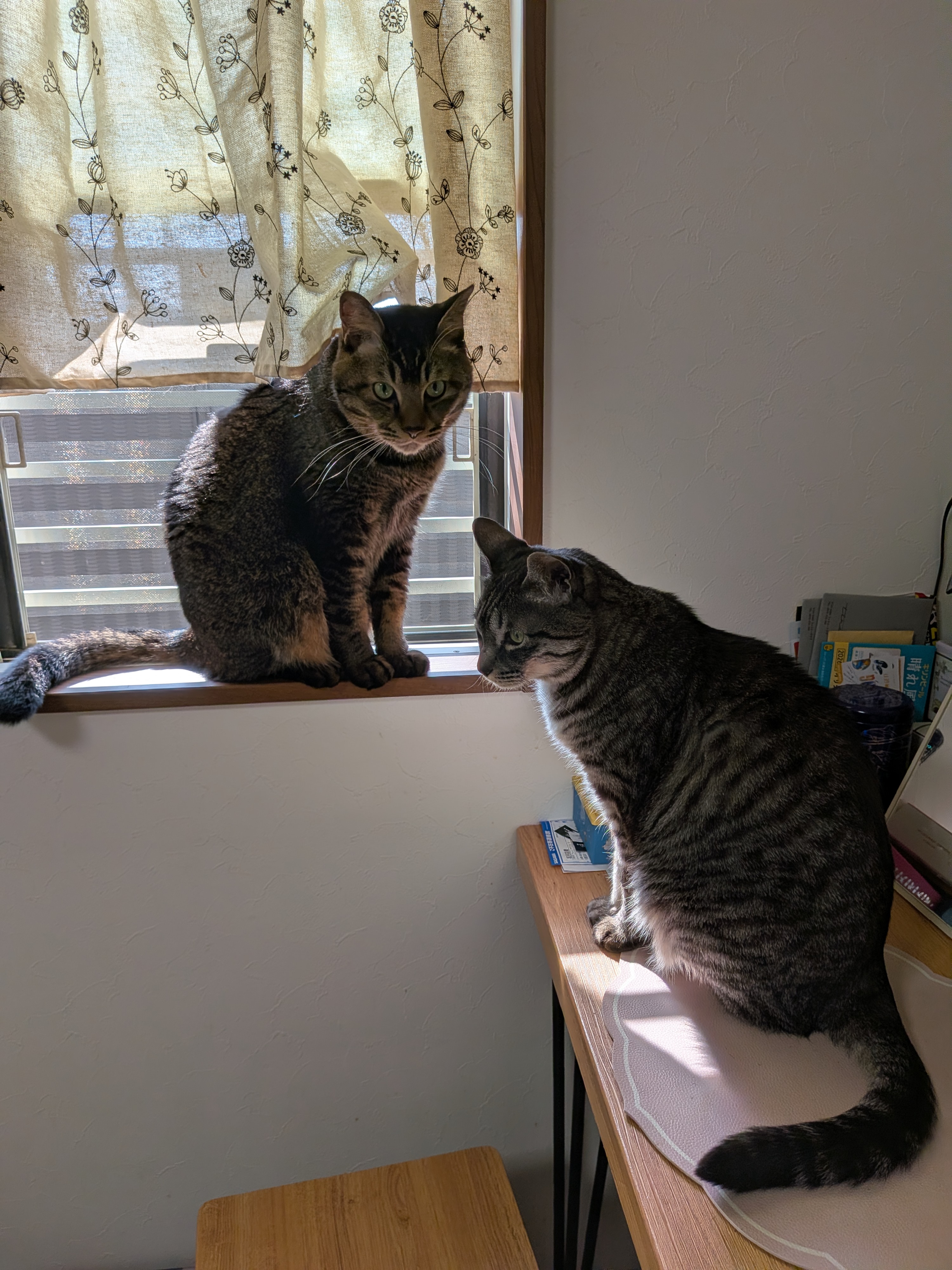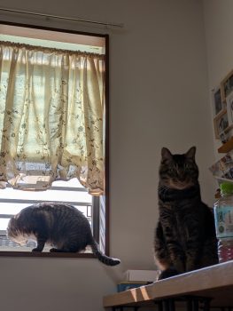 ぽかぽか 今日は、ぽかぽか陽気。 けーちゃんの花粉症もあまり感じなくなったようなので 許可を得て、リビングの窓を開けて換気を始めたら・・・ にゃんズがさっそくにゃるソックを開始しました。 「お兄ちゃん、狭い・・・あたちにも見せて」「はいはい、どうぞ」 とでも言っているかのよう。
